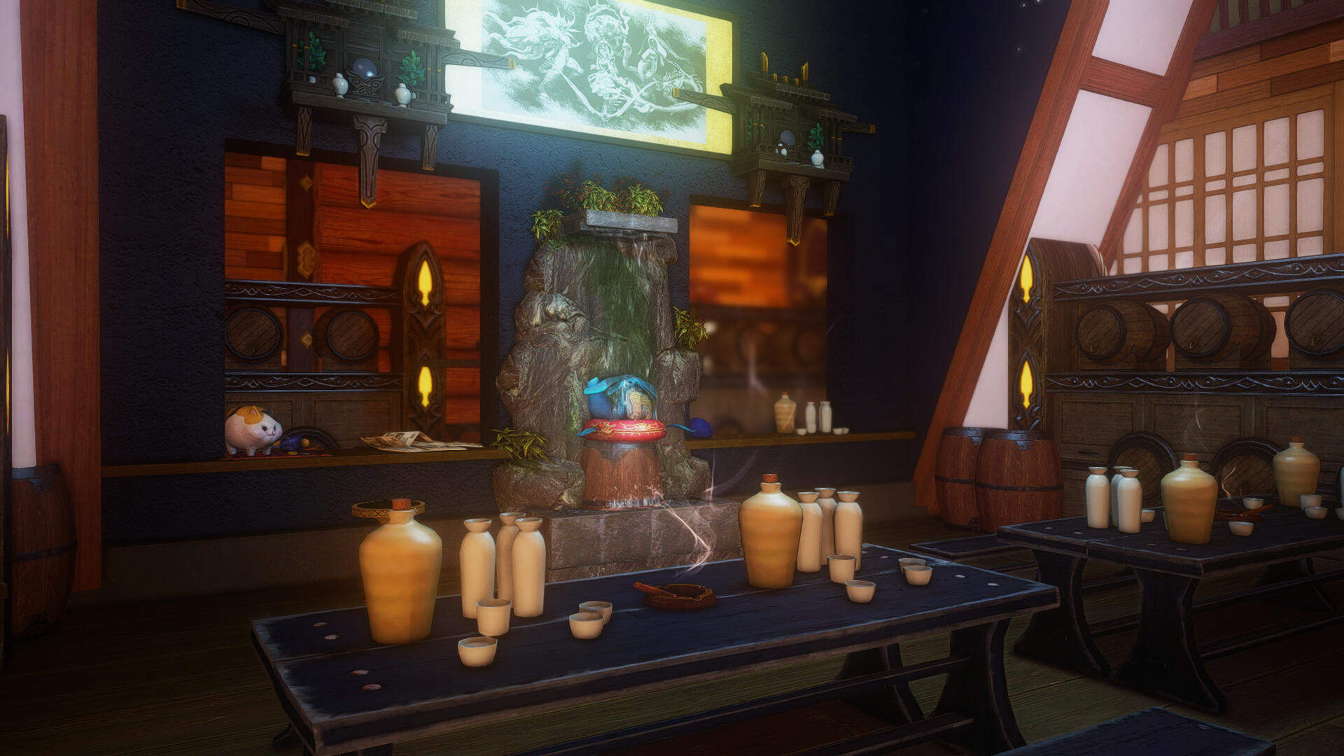 Okami Spirit Sake Brewery was founded and created by Tetsuro Wulf, an Okami Deity of Balance. Tetsuro has always been fascinated in brewing his own sake, given his village within the Yokai Realm would often do the same and distribute blessed sake to many different yokai clans. Tetsuro took interest in creating a shop in which others may be able to sample and his favor blessed sake in a comfortable and safe atmosphereThe establishment is heavily catered to the co-existence of yokai amongst mortals, and heavily welcomes those from another world!
